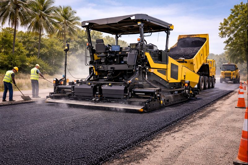Premium asphalt laying services using VG-30 grade bitumen with advanced paver finisher equipment.