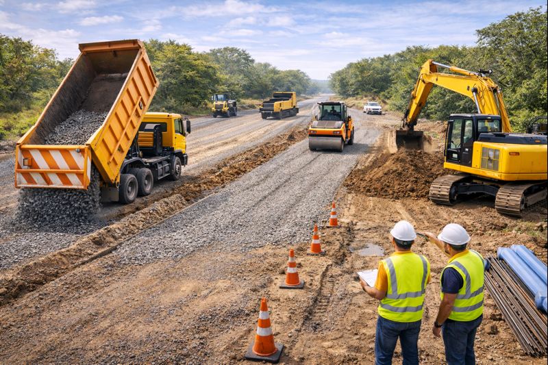 Complete road construction services from foundation to finishing for highways, residential layouts, and commercial complexes.